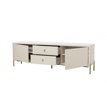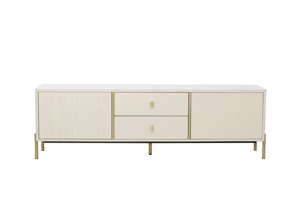 卡塔金巖板面板+米灰啞光主體+亮銅色金工腳、裝飾條、拉手